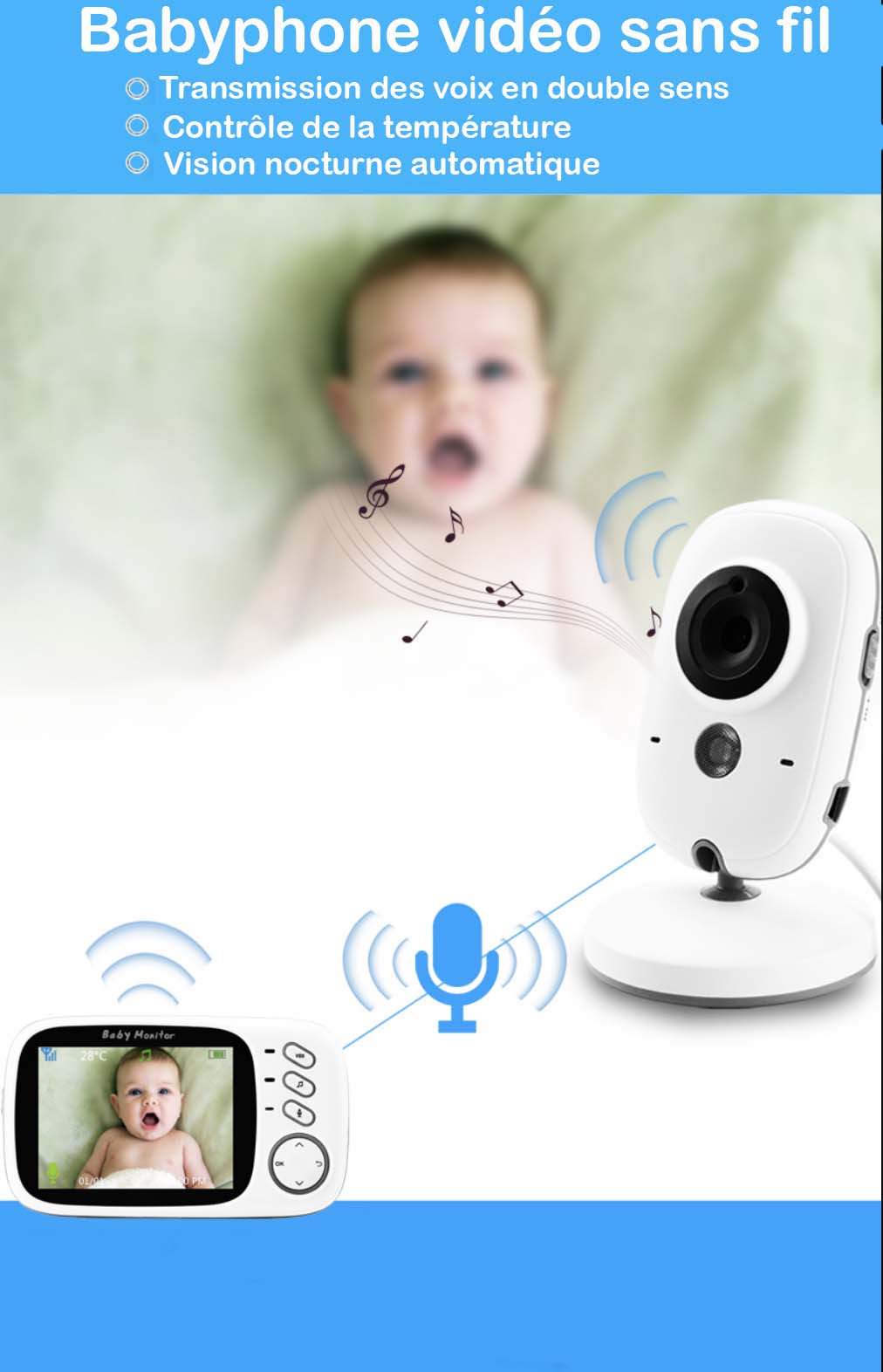 Le babyphone vidéo Babywatch+ sera vos yeux et vos oreilles dès lors que vous quitterez la chambre de bébé. Fini le stress et place à la quiétude. Avec Babywatch+ surveillez votre bébé depuis n’importe quelle pièce de la maison.